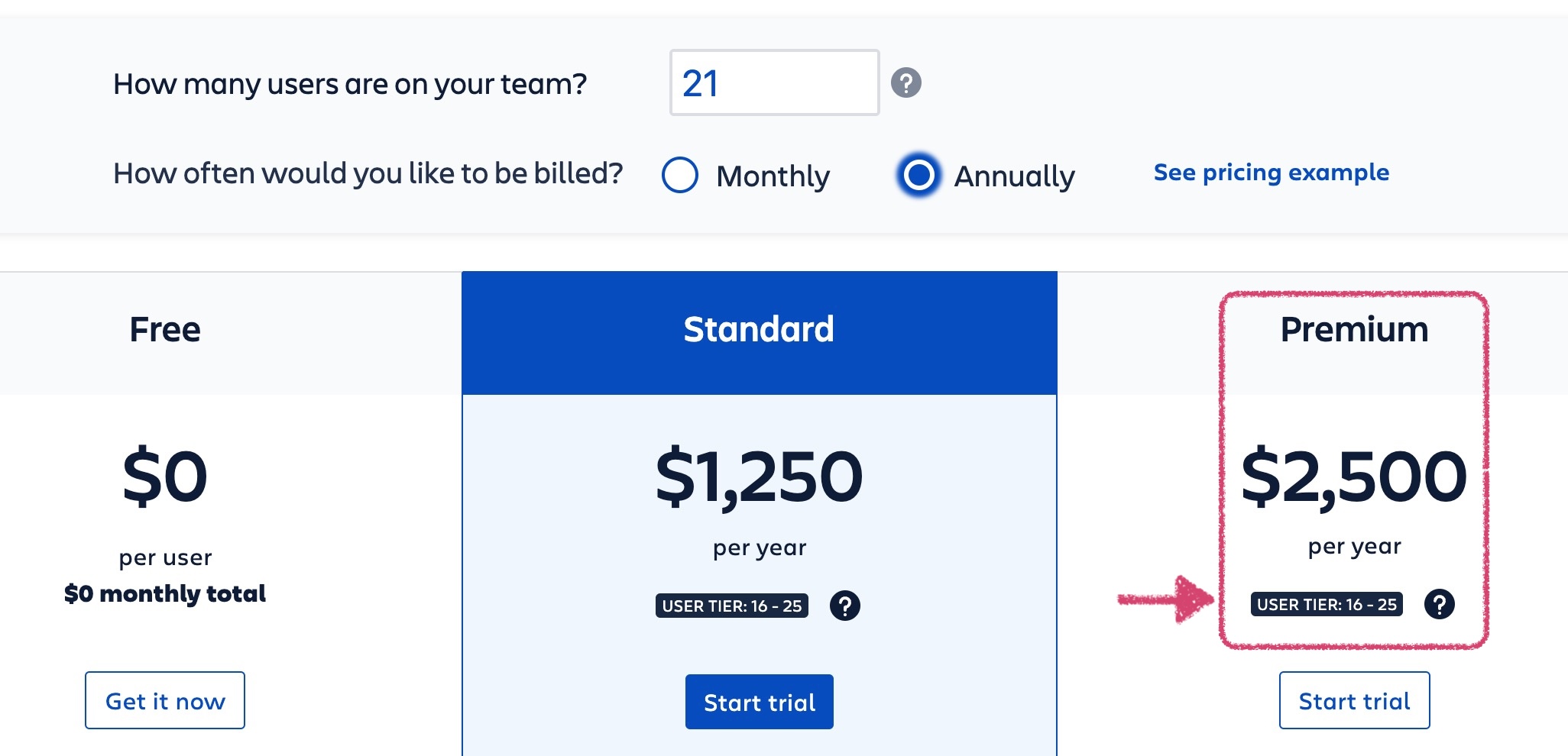- Annual pricing is tiered, and shows the total annual cost, accompanied by an identification of the tier level and the number of “filled” and “available” seats based on the number of users you input.