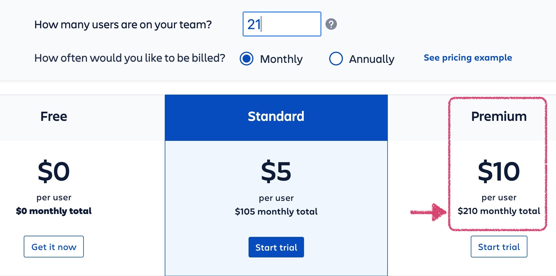 - A calculator at the top of the pricing chart that lets you input a number of users and select monthly or yearly billing to calculate an exact cost.