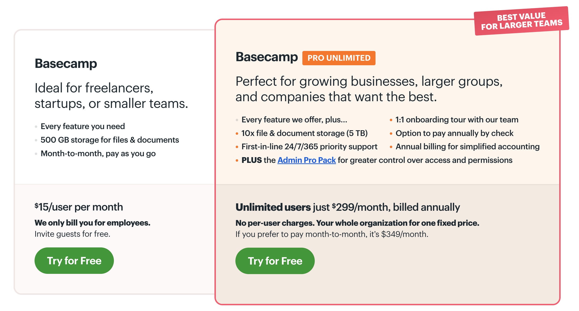 The Basecamp pricing page is straightforward:
