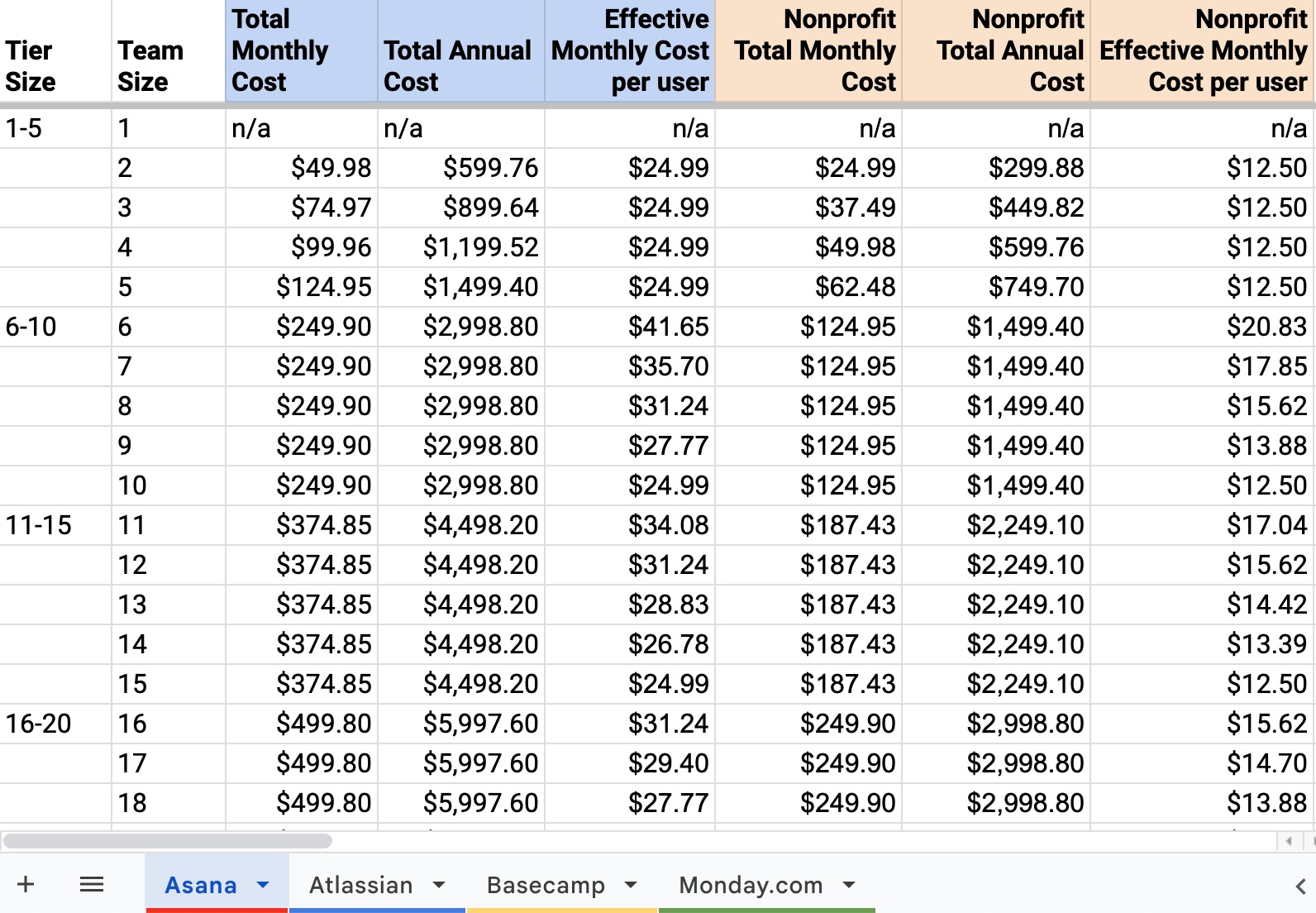 I created detailed pricing charts, including nonprofit pricing, to help you better understand how much you’ll pay to license a work management tool for your team (each product is on a separate tab in the Google Sheet).